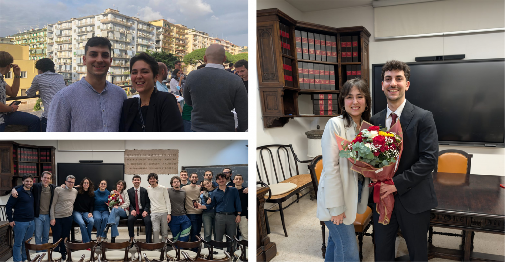 Gioacchino and Valentina on their first PhD day (top left), after their PhD defense (right), and with the POLYFUN group (bottom left).